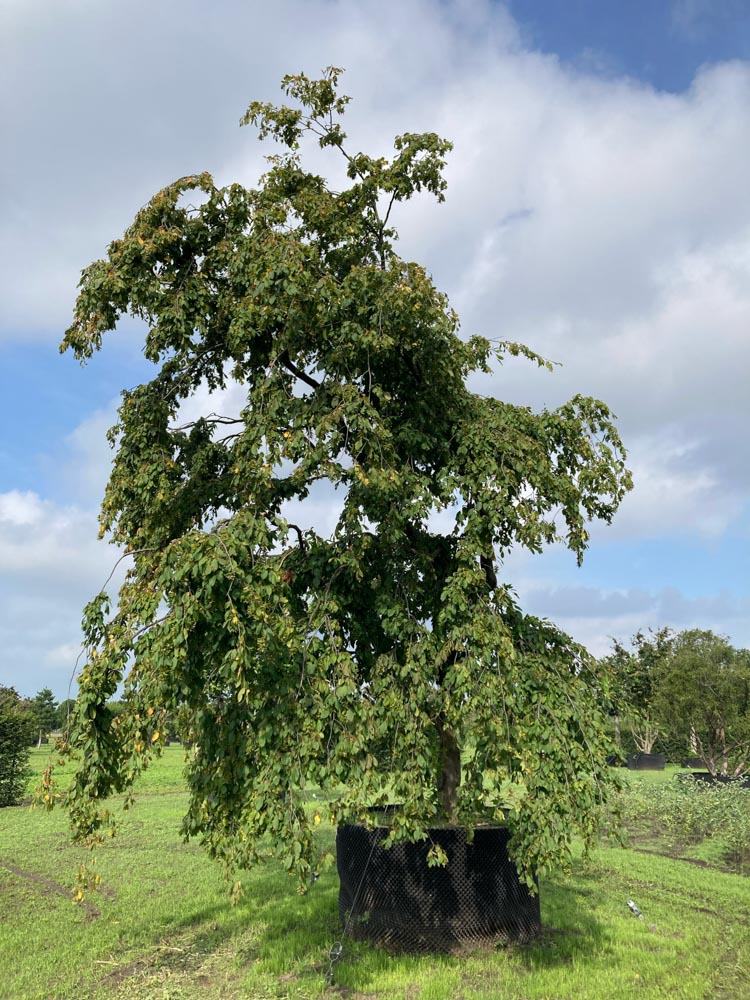 Carpinus betulus ‘Pendula’ is een sierlijke treurboom, afgeleid van de gewone haagbeuk die van nature voorkomt in een groot deel van Europa, van Engeland tot het Kaukasusgebied. Als treervorm onderscheidt ‘Pendula’ zich door zijn sterk hangende, wenende habitus: de takken groeien breed zijwaarts en buigen vervolgens steil naar beneden, wat een koepelvormige tot watervalstructuur oplevert die in het tuinontwerp een sterke sculpturale aanwezigheid heeft. De groeiwijze hangt af van de kweekvorm. Als hoogstam – op 30-35 cm stamomtrek – vormt hij een duidelijke stam met een hangende kroon erboven, wat een klassiek, elegant silhouet geeft. De stam is grijsbruin met het kenmerkende gespierde, geribbelde bastprofiel van de haagbeuk. Het blad is ovaal met een dubbel getand profiel, donkergroen en glanzend in de zomer, fris lichtgroen in het voorjaar. In de herfst kleurt het naar oranje tot geel, en droogt daarna uit tot bruin terwijl het aan de boom blijft hangen – het half-wintergroene gedrag dat kenmerkend is voor de gehele haagbeuksoort. Dit geeft ook in de winter enige scherming en structuur aan de hangende kroon. De bloei in april-mei is onopvallend: hangende groene katjes. Na de bloei vormen zich drielobbige schutbladen met kleine nootjes die decoratief zijn in de late zomer. De groeisnelheid is matig. ‘Pendula’ verdraagt snoei uitstekend, waardoor hij ook als snoeivorm en leiboom geschikt is. Bij Smits beschikbaar op 450/500 cm hoogte en als hoogstam op 30-35 cm stamomtrek.