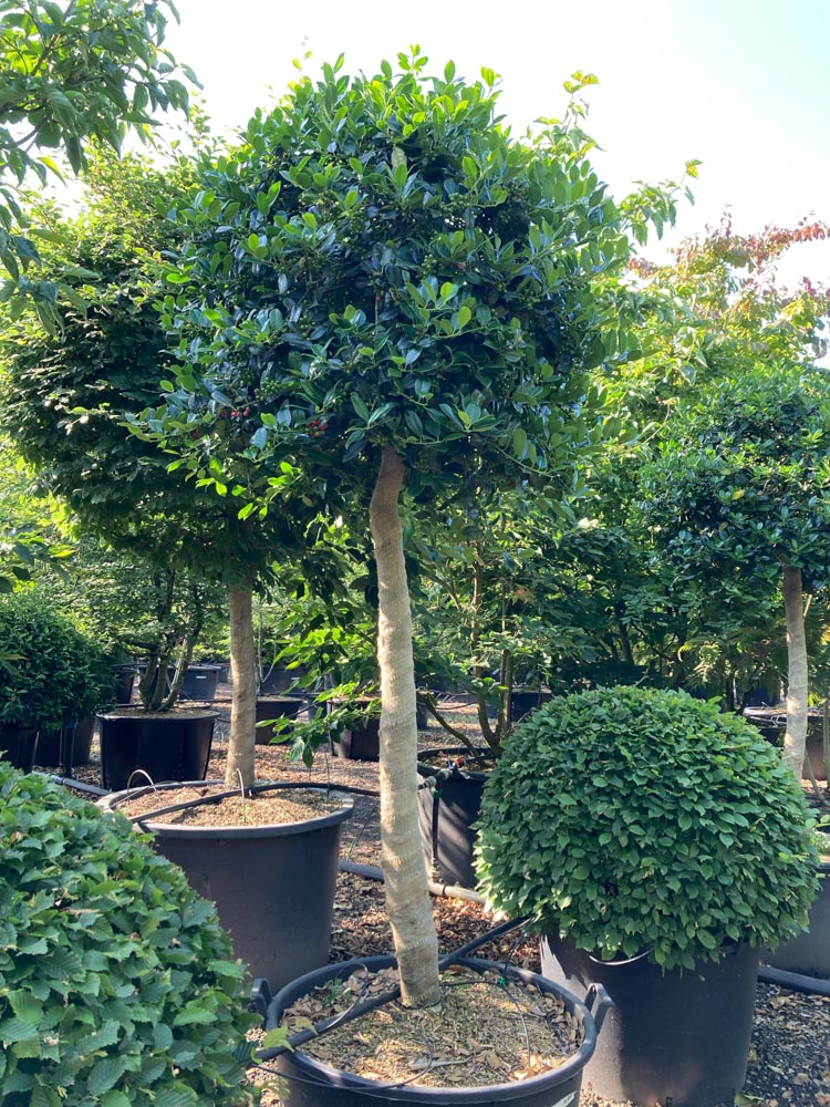 Ilex aquifolium ‘J.C. van Tol’ is een van de meest bekende en gewaardeerde hulstcultivars in Europa, vernoemd naar de Nederlandse kweker J.C. van Tol die de cultivar eind 19e eeuw selecteerde. De cultivar heeft twee uitzonderlijke eigenschappen die hem al meer dan een eeuw populair maken: het nagenoeg doornloze blad en de zelffertiliteit — ‘J.C. van Tol’ is in staat bessen te vormen zonder een aparte mannelijke bestiver. De groeivorm is breed conisch, met een dichte, goed gesloten kroon. Op volwassen leeftijd wordt de boom 4 tot 6 meter hoog. Bij Smits leverbaar als bolvormen op halfstam in stamomtrekken van 20-25 en 25-30 centimeter. De stam heeft de kenmerkende grijsgroene, gladde hulstbast. Het blad is donkergroen, glanzend en opvallend glad van rand — de doornen zijn slechts zwak aanwezig of geheel afwezig. Dat maakt ‘J.C. van Tol’ aangenamer om mee te werken bij het snoeien en planten dan doorndragende hulstcultivars. In alle seizoenen groen; volledig wintergroen. De bloei in mei en juni bestaat uit kleine, witte bloempjes. Door de zelffertiliteit vormt ‘J.C. van Tol’ zonder bestiver rijkelijk rode bessen die in de herfst en winter schitterend afsteken tegen het donkergroene blad. De bessen zijn een voedselbron voor wintervogels. Als bolvorm op halfstam heeft ‘J.C. van Tol’ een elegante, formele uitstraling die goed past in klassieke en hedendaagse tuinontwerpen. Groei is langzaam tot matig.