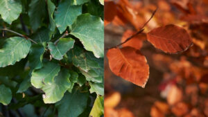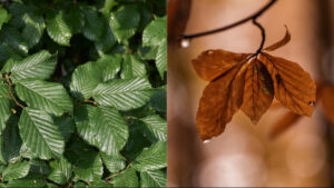 Beukenhaag vs haagbeuk: vergelijking in één oogopslag. Links Fagus Sylvatica (beukenhaag) en rechts Carpinus Betulus (haagbeuk).