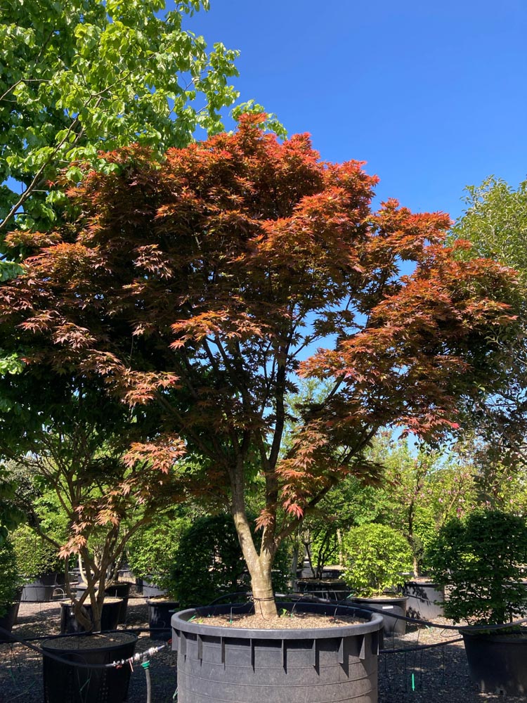 Acer japonicum, de Japanse esdoorn in zijn botanische vorm, is afkomstig uit Japan en Korea, waar hij groeit in bergbossen op voedselrijke, vochtige bodems. Hij is de grotere broer van de veelbekende Acer palmatum: breder van blad, krachtiger in groei en met een nog rijkere herfstkleur. De groeiwijze is breed struikvormig tot kleine boom, met meerdere opgaande stammen en een breed uitgespreide, open kroon. De stam is grijsbruin en glad tot licht gegroefd bij oudere exemplaren. Het blad is groot en opvallend: rondachtig in omtrek, met zeven tot elf lobben die diep ingesneden zijn en een fijne getande rand hebben. In het voorjaar verschijnt het blad fris groen, in de zomer wordt het dieper en glanzend donkergroen. De herfstkleur is spectaculair: rood, oranje en geel verschijnen tegelijk, soms allemaal op één blad. De kleur houdt lang aan en is intenser dan bij de meeste andere loofbomen. De bloei in april is kleine maar opvallend rode bloemtrosjes die hangen tussen het uitlopende blad. De groengele bloemtrossen vallen lichtjes op. Na de bloei ontwikkelen zich bruine gevleugelde vruchten. De groeisnelheid is matig. Door zijn compacte karakter en hoge sierwaarde is Acer japonicum een uitstekende keuze voor weloverwogen tuinontwerpen. Bij Smits beschikbaar als solitair exemplaar op 400/450 cm hoogte.