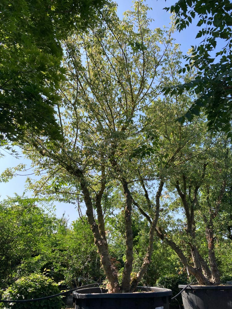 Acer negundo ‘Flamingo’ is een variegated cultivar van de vederesdoorn, een esdoornsoort die van nature voorkomt in Noord-Amerika, van Canada tot Mexico, langs waterlopen en in rijke alluviale gronden. De vederesdoorn onderscheidt zich van andere esdoorns door het geveerde, drievoudige tot vijfvoudige blad dat doet denken aan dat van een es, vandaar de naam. ‘Flamingo’ is geselecteerd om zijn opvallende variegatie: het jonge blad in het voorjaar is roze tot crèmewit, de kleur die de cultivar zijn naam geeft. In de loop van de zomer vergroent het blad gedeeltelijk maar crèmewitte tot witte markeringen blijven aanwezig, samen met roze tinten aan de jonge scheuten en rand van de bladeren. De groeiwijze is snel en breed uitspreidend als meerstammige boom, met een open, luchtige kroon. De stam is grijsgroen bij jonge takken. In de herfst kleurt het blad rood tot oranje tot geel voor de bladval. De bloei in maart tot april is onopvallend maar vroeg: groengele bloemtrossen hangen vóór het uitlopen van het blad aan de takken. Na de bloei vormen zich talrijke gevleugelde zaadjes die lang decoratief blijven. Een aandachtspunt: de vederesdoorn kan sterk uitzaaien; in de nabijheid van tuinranden is regelmatig beheer van zaailingen verstandig. Bij Smits beschikbaar als meerstammig op 500/600 cm hoogte.