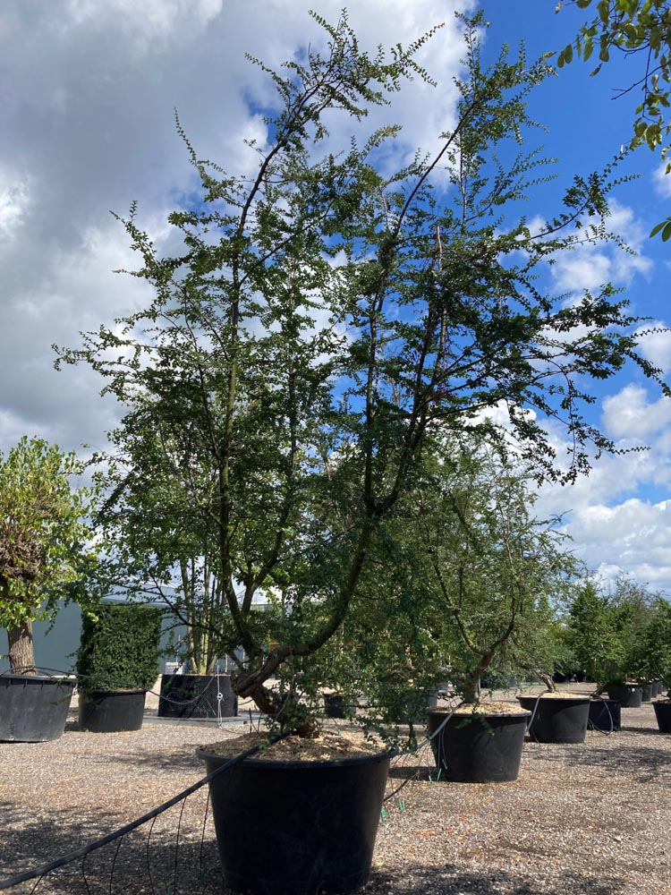 Nothofagus antarctica, de schijnbeuk, is afkomstig uit het zuiden van Chili en Argentinië, tot aan de boomgrens in Patagonië en Vuurland. De naam ‘antarctica’ verwijst naar de zuidelijke ligging van het verspreidingsgebied, niet naar Antarctica zelf. Het is een ongewone en botanisch interessante boom die in Europa steeds meer aandacht krijgt bij kenners en gespecialiseerde tuinontwerpers. De groeiwijze is schilderachtig en onregelmatig, met een open, vertakkend karakter. De stam en oudere takken ontwikkelen een karakteristieke, donkergrijze tot zwart gekleurde bast met een opvallend geplooide, wriemelende textuur die ook in de winter bijzondere sierwaarde heeft. Het blad is klein, rondachtig tot hartvormig, fijn getand en donkergroen in de zomer. In de herfst kleurt het blad helder geel, wat een mooi contrast geeft met de donkere bast. De bladeren zijn kleiner dan bij een gewone beuk, wat de boom een sierlijk, fijntexturig karakter geeft. De bloei is onopvallend: kleine groene bloempjes in het voorjaar. Na de bloei vormen zich kleine bruine nootjes. De groeisnelheid is matig. De boom kan in zijn thuisgebied flink groot worden, maar in West-Europese tuinen blijft hij doorgaans kleiner en beheersbaar. Bij Smits beschikbaar als solitaire opzet op 300/350 cm en 400/450 cm hoogte. Het is een boom die weinig wordt aangeboden maar veel te bieden heeft voor de liefhebber van het ongewone.