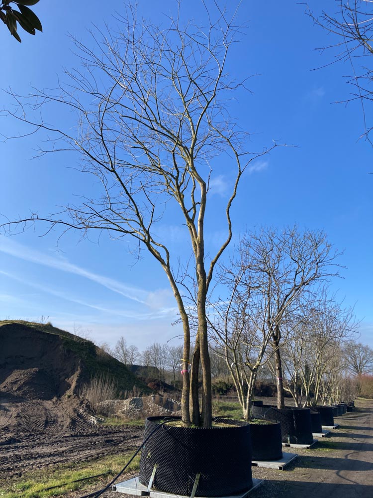 Styphnolobium japonicum, de honingboom of Japanse pagodeboom, is ondanks zijn naam afkomstig uit China, waar hij al meer dan duizend jaar in cultuur is en nog steeds veelvuldig wordt geplant bij tempels en historische gebouwen. De naam ‘japonicum’ ontstond doordat vroege Europese botanici de soort via Japan leerden kennen. In Europa werd hij in de achttiende eeuw geïntroduceerd en is sindsdien geliefd als park- en laanboom. De groeiwijze is breed uitspreidend met een open, aantrekkelijke kroonstructuur en sterk horizontale vertakking. De stam is grijsbruin en ontwikkelt met de leeftijd een kenmerkende, diep gegroefd-gefissureerde bast. Het blad is geveerd, lichtgroen in het voorjaar, donkergroen en glanzend in de zomer. In de herfst kleurt het blad helder geel. De bloei valt laat in het seizoen: in augustus tot september verschijnen grote trossen roomwitte tot geelwitte vlinderbloemen die een intense, zoete geur verspreiden en bijzonder aantrekkelijk zijn voor bijen. Dit is de laatste grote bloeiboom van het seizoen voor bestuivers. Na de bloei vormen zich karakteristieke groene peulen die geel worden en lang aan de boom blijven. Groeisnelheid is matig, droogte- en windtolerant, kustbestendig. Bij Smits beschikbaar als meerstammig van 300/350 cm tot 800/900 cm hoogte.